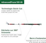 - Contenu de la livraison : AdvancedPrune 18V-45, barre d’extension, couvre-lame, notice d’utilisation, emballage en carton