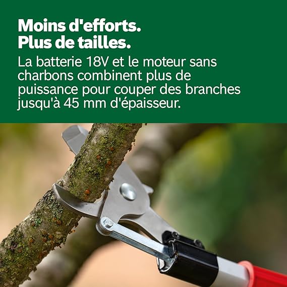 - Sécateur sans fil Bosch AdvancedPrune 18V-45 (pour couper sans effort les branches jusqu’à 45 mm ; système 18 V ; jusqu’à 600 coupes ; avec barre d’extension ; sans batterie ou chargeur)
