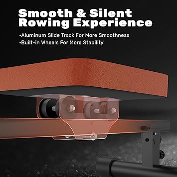 - RAIL COULISSANT LONG – Le long rail coulissant rend le rameur adapté aux personnes mesurant de 140 à 190 cm. Conçu pour les adolescents et les adultes. Si vous voulez uniquement entraîner le haut du corps, vous pouvez fixer la position assise avec le bouchon à vis.