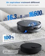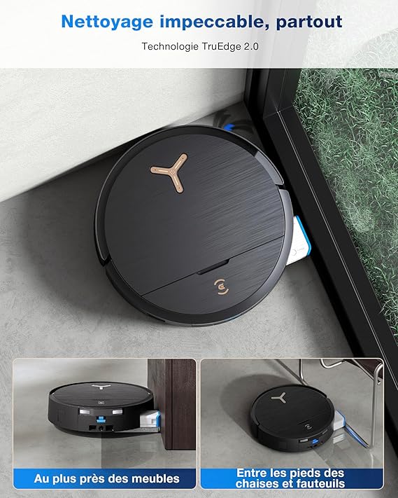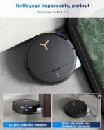 • 【Technologie ZeroTangle 3.0 et TruEdge 2.0】La technologie ZeroTangle 3.0 combine une brosse latérale anti-nœuds ARClean avec une brosse principale dirigée par cyclone pour éviter que les poils/cheveux ne s’emmêlent, l’idéal pour les foyers avec des animaux de compagnie ou des personnes aux cheveux longs. La technologie TruEdge 2.0 avec capteur de bords 3D permet l’extension dynamique des patins à rouleau et des brosses latérales pour nettoyer à moins de 1 mm des bords et des coins, même autour de plinthes ou de pieds de meuble irréguliers. Il soulève les patins quand il passe sur les tapis et moquettes pour éviter de les mouiller et augmente l’aspiration pour les tapis épais.