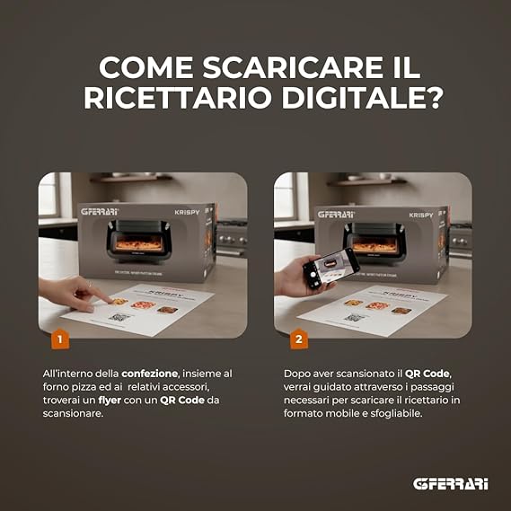 • Accessoires inclus : pierre réfractaire 32×32 cm, panier air fryer 30×27,5 cm, plateau BBQ 32×30 cm, pelle en aluminium, roulette à pizza, poignée et livre de recettes numérique. Poids : 12 kg | Dimensions : 41,5 × 25 × 52 cm | Alimentation : 220–240 V ~ 50–60 Hz