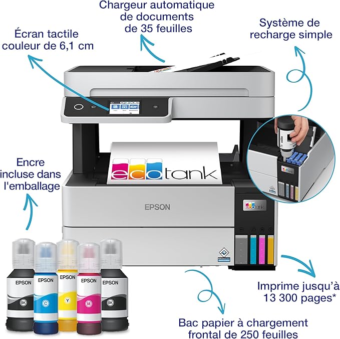 - Économies à long terme – Réalisez des économies grâce à ce modèle EcoTank qui offre un coût d’impression par page très bas – Contrairement à d’autres imprimantes, ce modèle EcoTank est équipé de bouteilles d’encre économiques