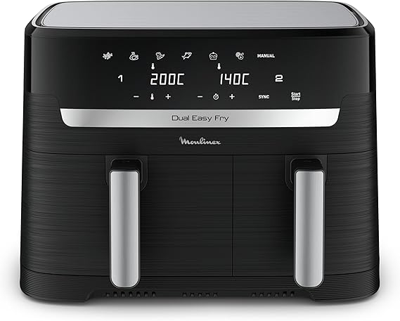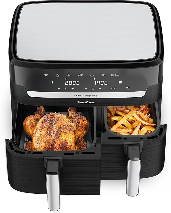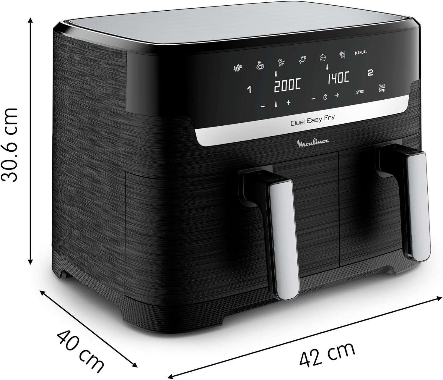 - CONTENU: air fryer Easy Fry Dual, 2tiroirs pour cuisson à air chaud amovibles, guide de démarrage rapide, mode d’emploi, application gratuite